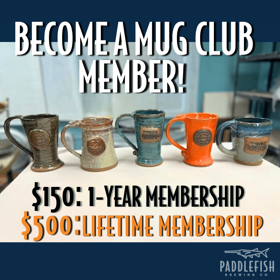 • Beer me that mug! Choose this perk and enjoy a perpetual flow of extra beer in your very own handmade ceramic mug FOR LIFE (20oz for the price of 16oz). Picture yourself strolling through our taproom, proudly wearing your fancy Paddlefish t-shirt and hat while carrying your own handmade mug. It’ll reside in the taproom, but it’s exclusively yours for life. As a bonus, we’re inviting you to our soft opening event, and to show our deep appreciation for your unwavering devotion to craft beer, your name will be forever etched on a taproom brick, celebrating your love for exceptional brews forever and ever.